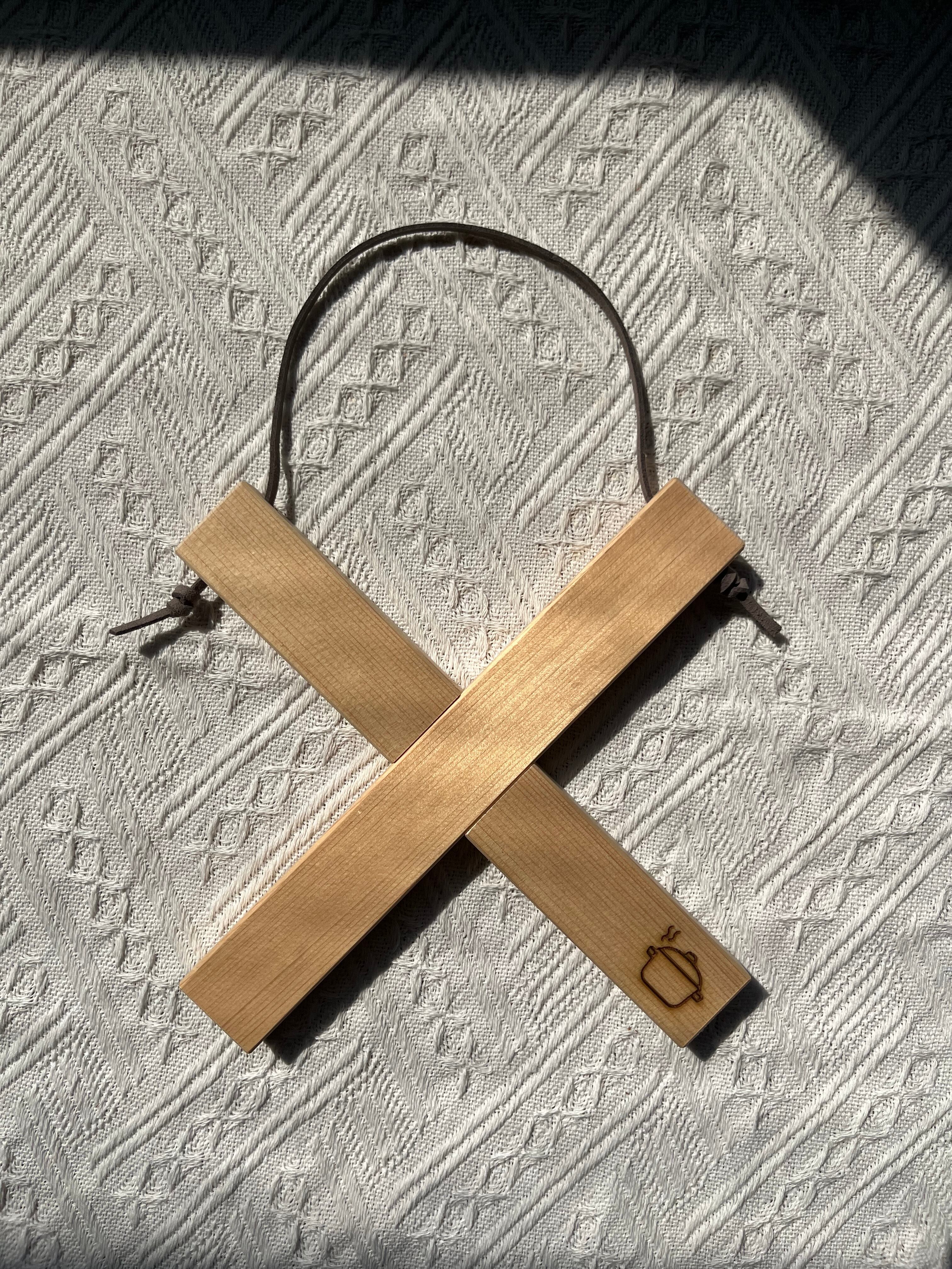 縦20cm × 横3cm × 厚さ1.5cm の無駄のない形は、使うときは十字に組んで、鍋やポットをしっかり支えます。